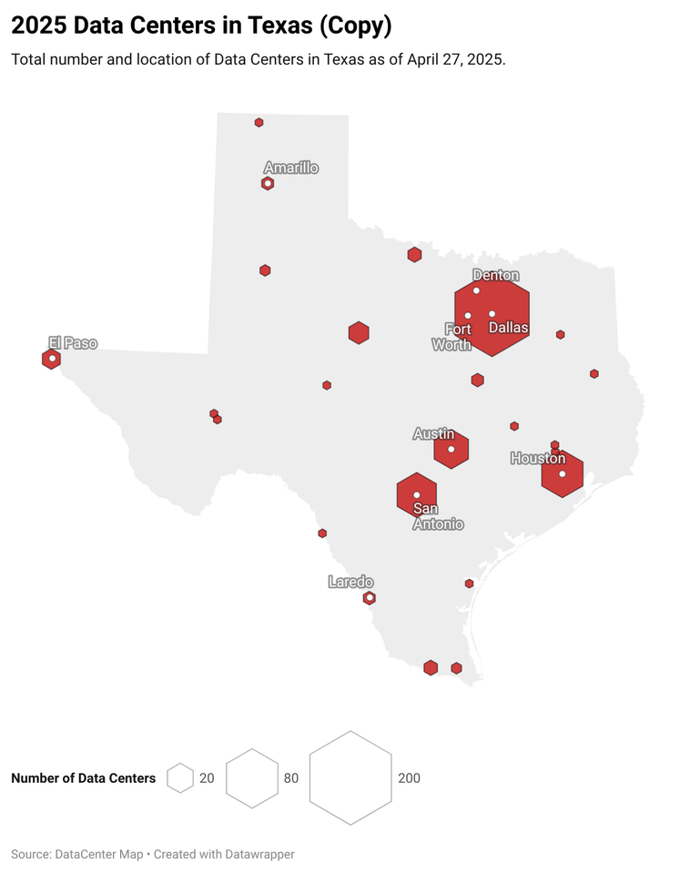 This map represents the locations of 326 data centers in Texas as of April 26, 2025 according to data from the Texas Data Center Map. There are 166 data centers in the Dallas-Fort Worth and Denton area. There are 49 data centers in Houston, 44 in San Antonio and 33 in Austin.